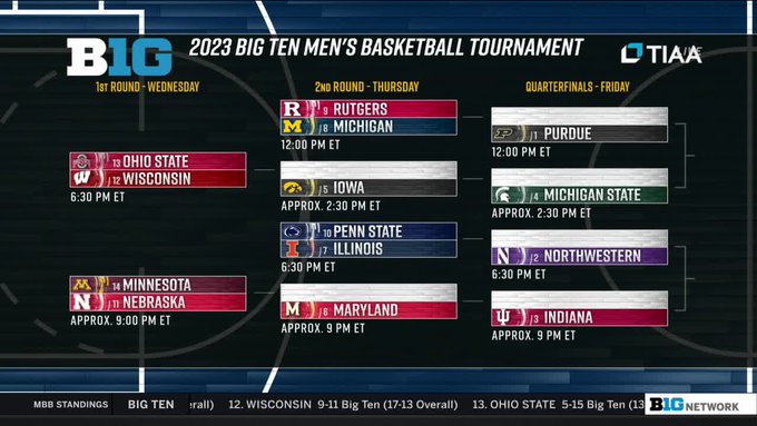 The conference tournament gets underway with a pair of first-round matchups on March 8 and. 14 Northwestern 25 minutes following Game 1 BTN Thursday March 2 Second Round Game 3 8 Nebraska vs.